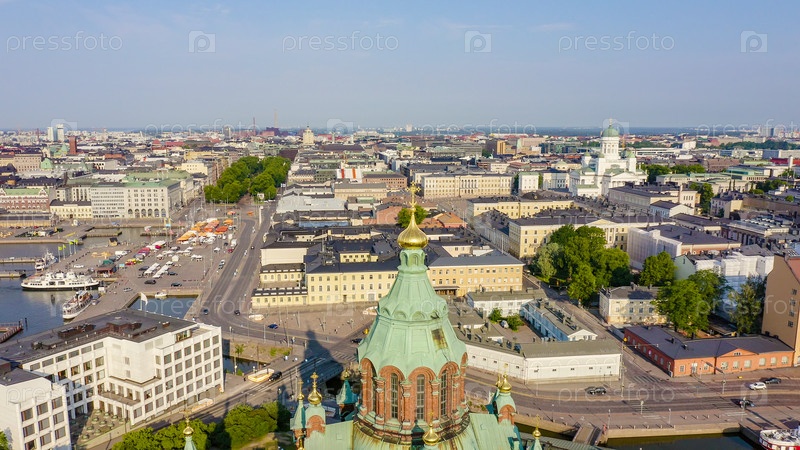 Хельсинки, Финляндия. Вид с воздуха на центр города. Успенский собор, с дрона