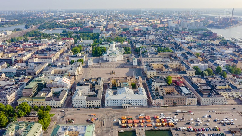 Хельсинки, Финляндия. Вид с воздуха на центр города. Хельсинкский собор. Сенатская площадь. Рыночная площадь, от дрона