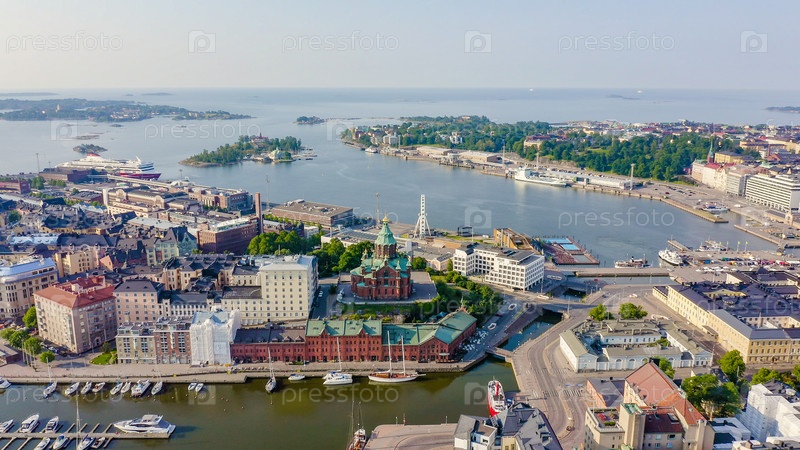 Хельсинки, Финляндия. Вид с воздуха на центр города. Успенский собор, с дрона