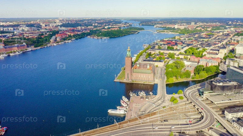 Стокгольм, Швеция. Стокгольмская ратуша. Стокгольмский стадшус. Построен в 1923 году, ратуша из красного кирпича, From Drone