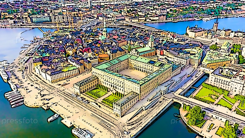 Стокгольм, Швеция. Королевский дворец. Яркая иллюстрация в мультяшном стиле. С высоты птичьего полета