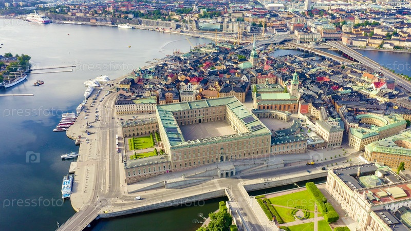 Стокгольм, Швеция. Королевский дворец в Стокгольме. Слот Кунглига. Вид с воздуха, с дрона