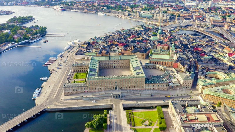 Стокгольм, Швеция. Королевский дворец в Стокгольме. Слот Кунглига. Вид с воздуха, с дрона