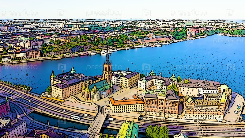 Стокгольм, Швеция. Старый город. Риддархольмен. Яркая иллюстрация в мультяшном стиле. С высоты птичьего полета