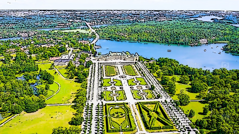 Стокгольм, Швеция. Хорошо сохранившаяся королевская резиденция с садами. Яркая иллюстрация в мультяшном стиле. С высоты птичьего полета