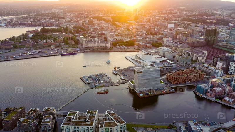Осло, Норвегия. Вид на город во время захода солнца. Заднего света. Центральная часть города. Оперный театр Осло. Operahuset Oslo, From Drone