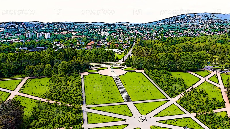 Осло, Норвегия. Общественный парк в городе Осло. Яркая иллюстрация в мультяшном стиле. С высоты птичьего полета