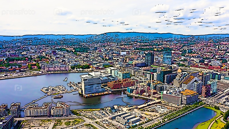 Осло, Норвегия. Центр города с воздуха. Набережная Осло-фьорда. Яркая иллюстрация в мультяшном стиле. С высоты птичьего полета