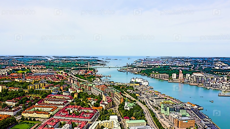 Гетеборг, Швеция. Панорама центральной части города. Облачная погода. Яркая иллюстрация в мультяшном стиле. С высоты птичьего полета