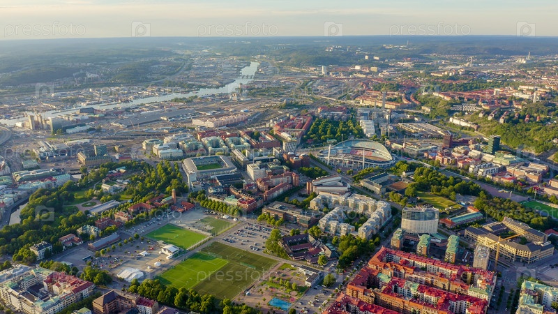 Гетеборг, Швеция. Панорама города и реки Гоэта Эльв. Исторический центр города. Закат, С Дрона