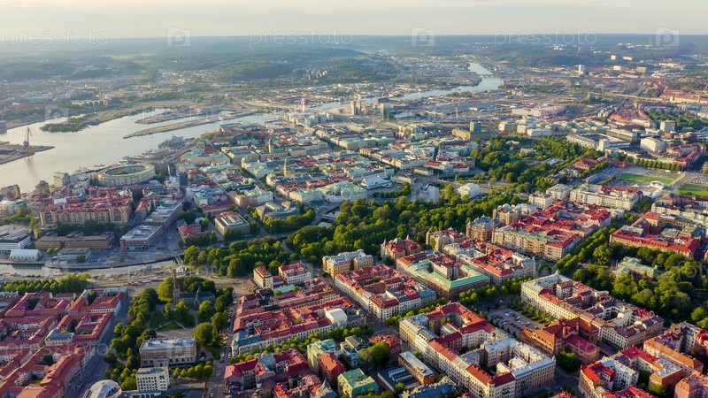 Гетеборг, Швеция. Панорама города и реки Гоэта Эльв. Исторический центр города. Закат, С Дрона
