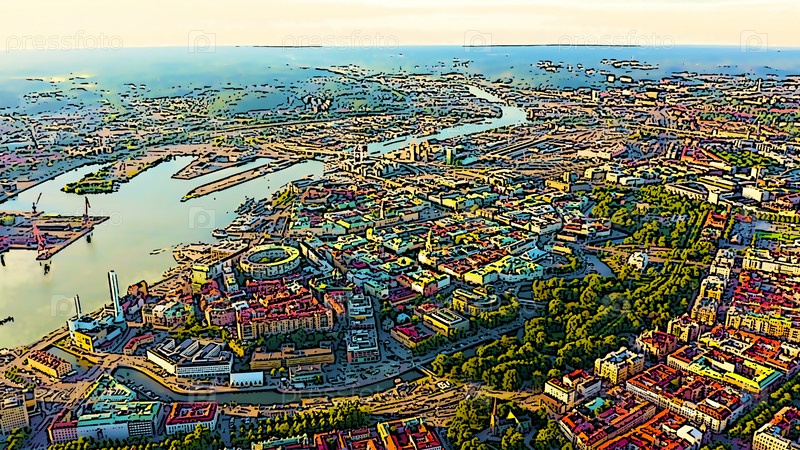 Гетеборг, Швеция. Панорама города и реки Гоэта Эльв. Исторический центр города. Закат. Яркая иллюстрация в мультяшном стиле. С высоты птичьего полета