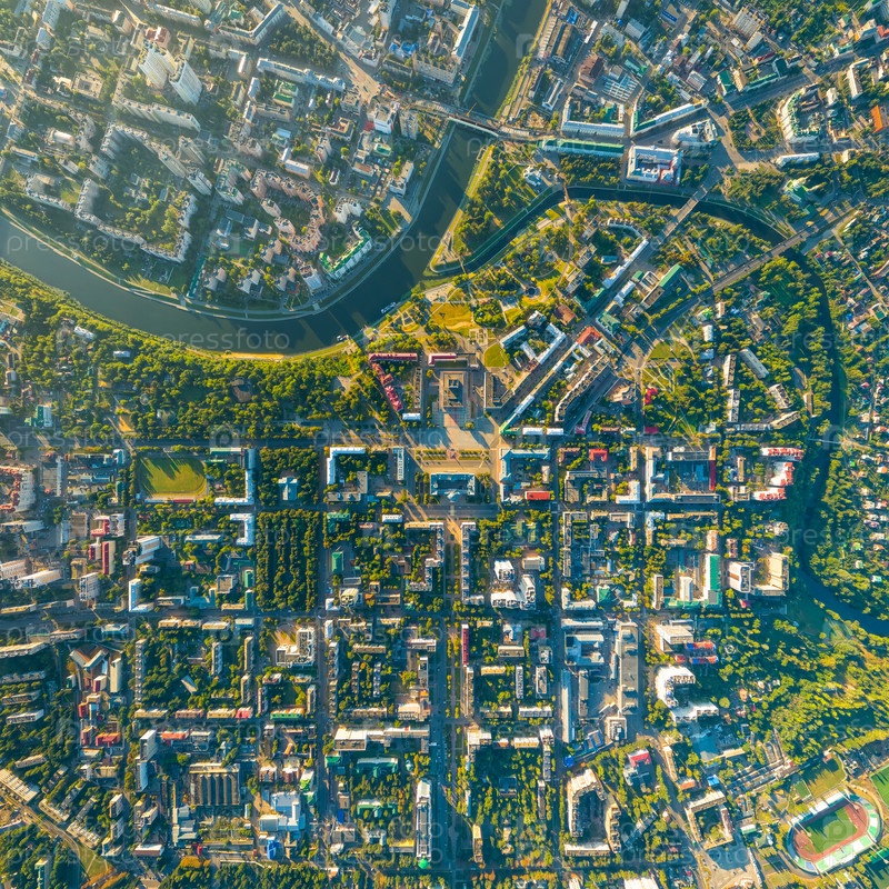 Орел, Россия. Панорама центра города с воздуха утреннего времени. С высоты птичьего полета