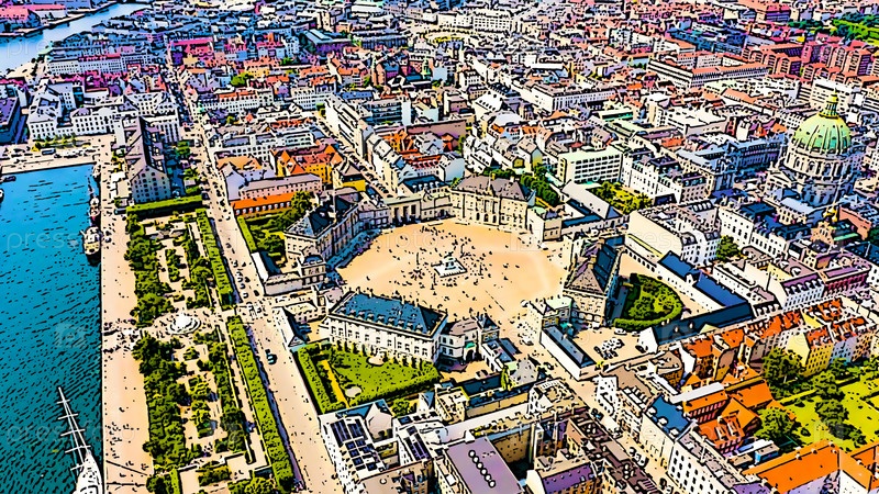 Копенгаген, Дания. Амалиенборг. Дворцовый комплекс XVIII века в стиле рококо. Яркая иллюстрация в мультфильмовом стиле. С высоты птичьего полета