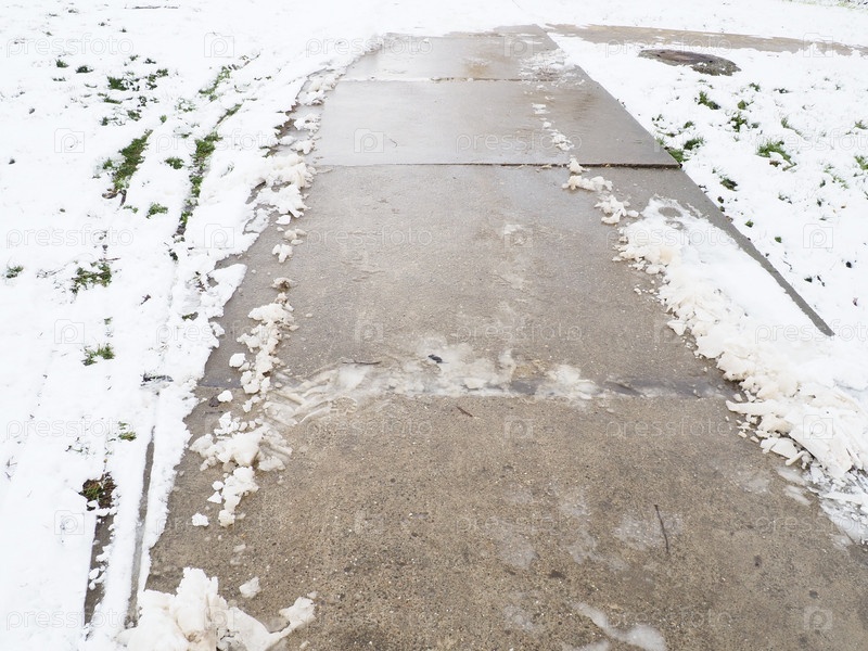 Мокрый скользкий тротуар со следами. Опасный лед. Грязная погода зимой. Следы автомобильных шин. Работа коммунальных служб по уборке