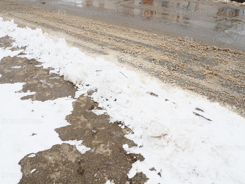 Обочина со сугробом. Сложные условия вождения. Мокрый скользкий тротуар со следами. Опасный лед. Грязная погода зимой. Следы автомобильных шин. Работа коммунальных служб по уборке