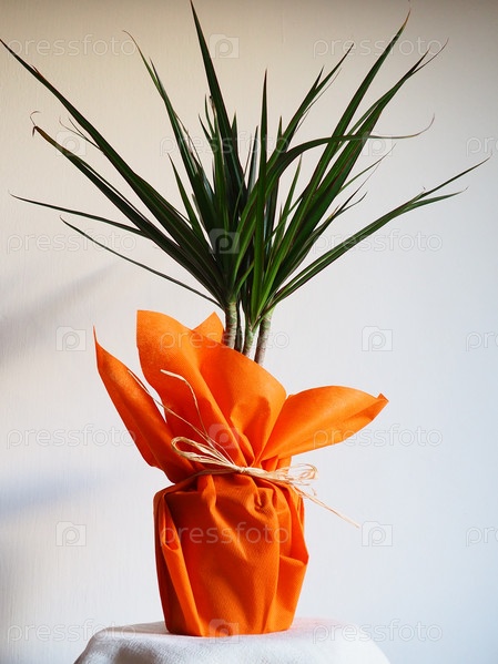 Драцена, тропическое растение как предмет интерьера. Подарок в оранжевой оберточной бумаге на столе с белой салфеткой. Белый фон. Драцена или Драценовые