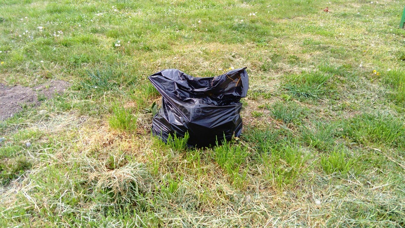 Черный мешок для мусора на травяном поле. Черный мешок для мусора на траве для уборки двора или для уборки