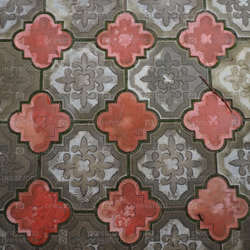 Мощеная улица или дорога, выложенная квадратными и закругленными декоративными бетонными плитками серого и красного цветов. Текстура камня. Геометрический восточный узор на полу. Тротуарный, парковый или пешеходный вариант оформления