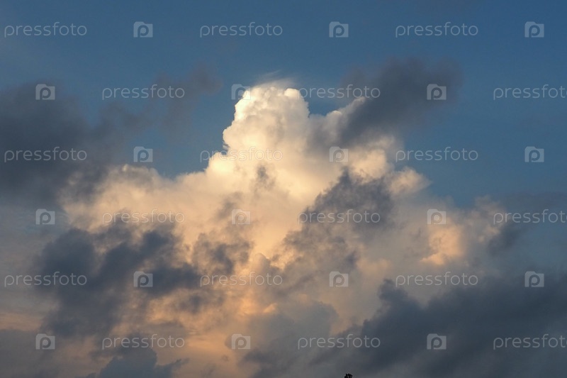 Красивое облако, освещенное солнцем во время заката. Голубое небо и темно-серые облака по краям. Вечернее небо. Изменение климата, авиация, гидрометеорология. Кучевые хлопковые облака в стратосфере