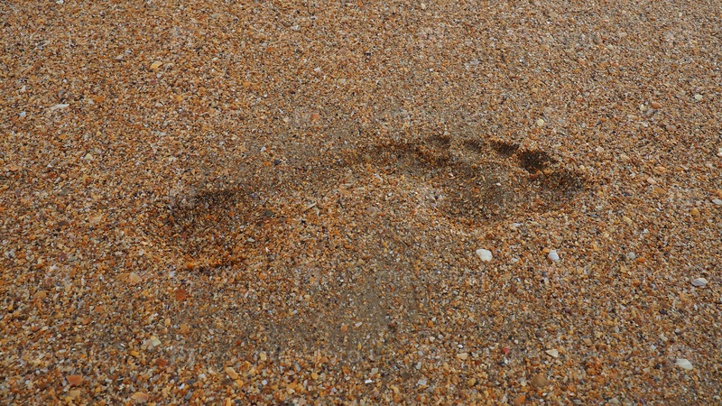 След на закате с мокрым песком. Песчаный мокрый пляж и шаги. Лечебный крупнозернистый кварцевый песок с ракушками. Витязево, Анапа, Краснодарский край, Россия. Туристические следы