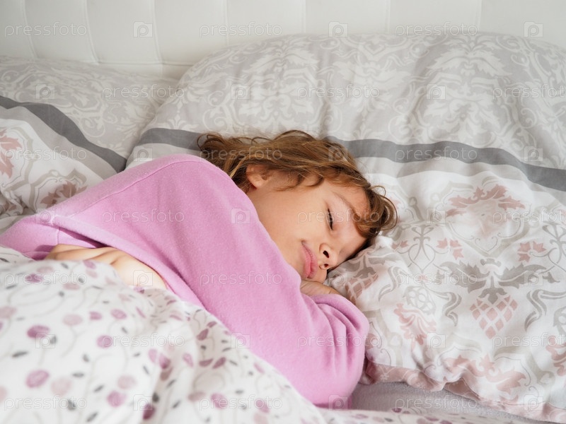Красивая кавказская девочка 8 лет со светлыми волосами, одетая в розовую пижаму, спит на кровати с пушистым одеялом, обнимая подушку. Мягкий свет утреннего солнца струится через окно