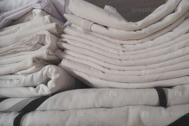 Белое белье сложено в шкафу. Внутреннее содержимое бельевого шкафа. Бытовая организация. Гигиенические условия для сна. Ткани и простыни в полуоткрытом белом шкафу или гардеробе