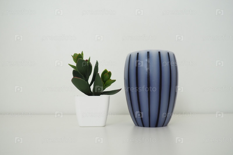 Ароматизированная серая полосатая свеча на белой поверхности с белым фоном позади. Декор интерьера. Искусственное зеленое растение в маленьком белом горшке. Вечнозеленая имитация алоэ, крассулы или каланхоэ