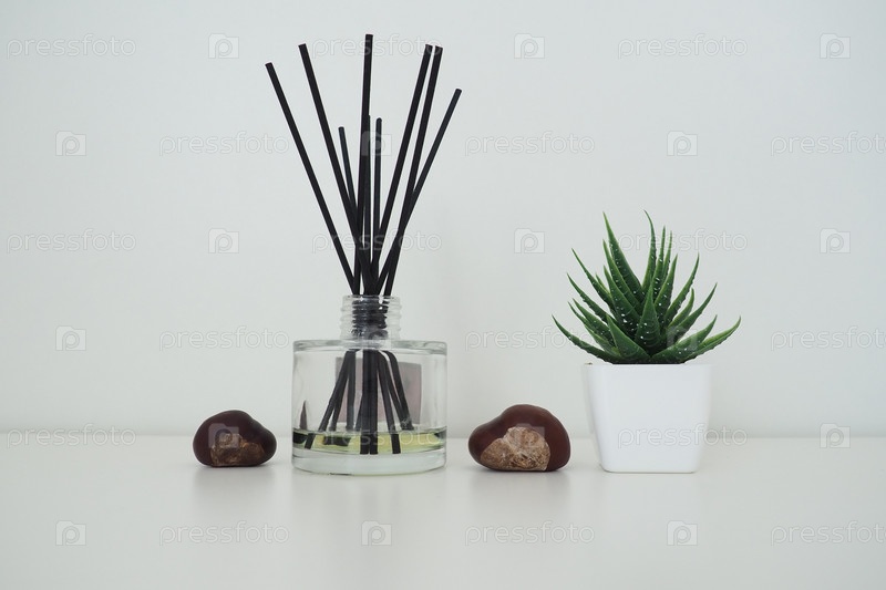 Ароматические палочки опускают в стеклянный кубический сосуд с эфирными маслами. Декор интерьера. Белый фон. Запах зимнего каштана. Плоды каштана. Сансевьера или алоэ в горшке
