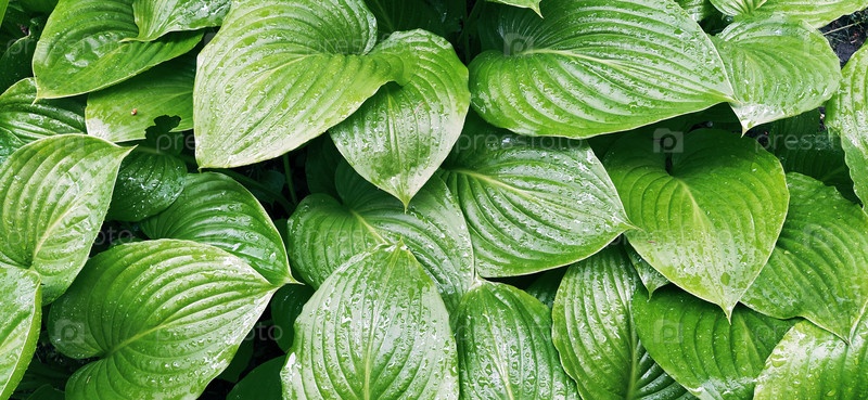 Хоста, род многолетних травянистых растений семейства Спаржевые. Садоводство и ландшафтный дизайн. Теневыносливые декоративно-лиственные растения. Зеленые листья с каплями воды