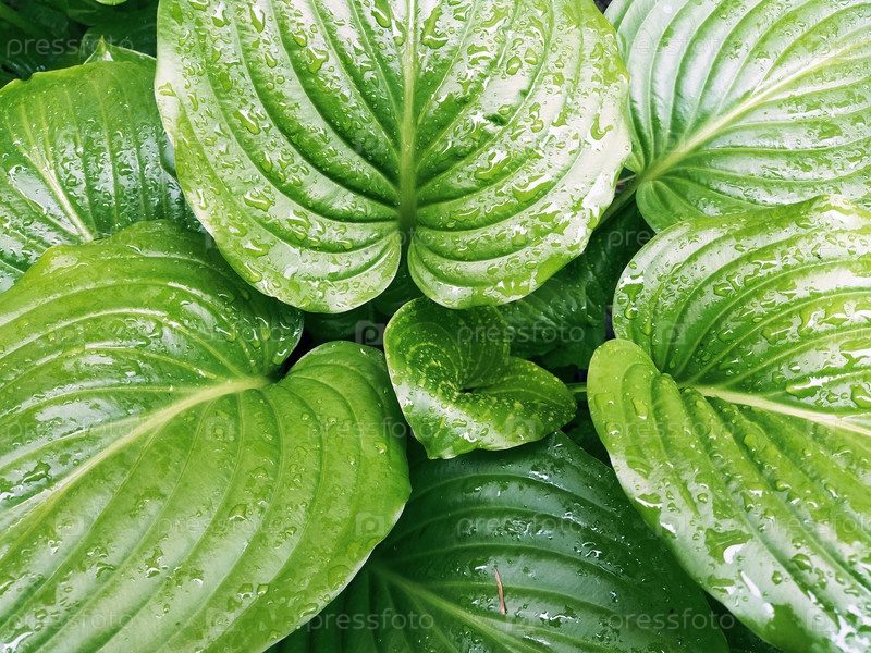 Хоста, род многолетних травянистых растений семейства Спаржевые. Садоводство и ландшафтный дизайн. Теневыносливые декоративно-лиственные растения. Зеленые листья с каплями воды