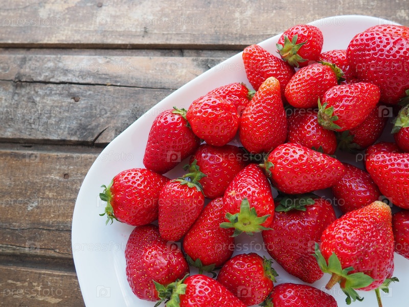 Клубника на тарелке, деревянный фон. Белая посуда и вкусная красная крупная садовая клубника. Здоровое питание, витамины и вегетарианская диета. Натюрморт с едой. Скопируйте пространство. Плоская укладка