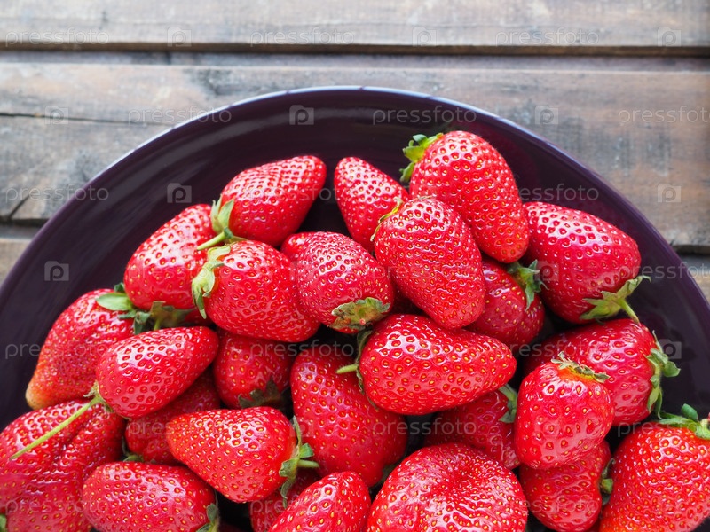 Клубника на тарелке, деревянный фон. Темная керамическая посуда и вкусная красная крупная садовая клубника. Здоровое питание, витамины и вегетарианская диета. Натюрморт с едой. Скопируйте пространство. Плоская укладка