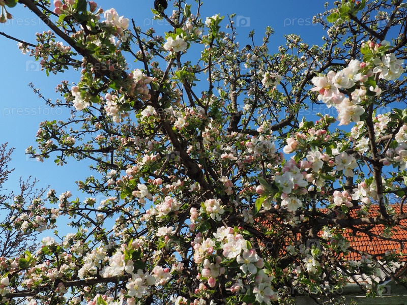 Цветущие цветы на яблоне. Яблоня в цвету. Белые и розовые красивые цветы на ветвях дерева. Голубое небо и красная черепица на заднем плане. Весеннее цветение