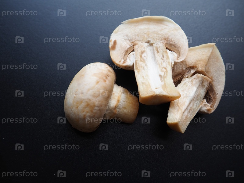 Шампиньоны на черном фоне. Нарезанные и целые свежие сырые сырые грибы. Приготовление грибов по рецепту
