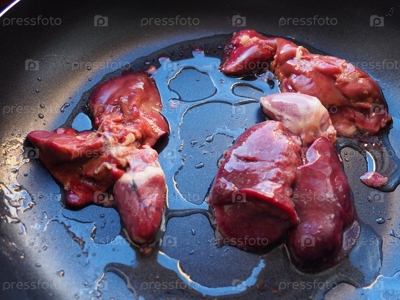 Куриную печень, почки и сердце в сковороде с антипригарным покрытием. Потроха птицы помещают в темную посуду и сбрызгивают растительным маслом. Приготовление пищи с высоким содержанием гемового железа. Антианемическая диета