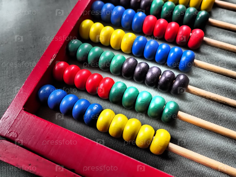 Концепция образования - счеты с множеством разноцветных бусин. Красные, синие, зеленые, черные, желтые детали на счетах. Математические упражнения. Школьная программа