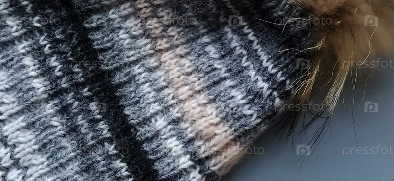 Вязаная шапка с крупным планом тыквы на сером основном фоне. Реклама зимней одежды. Зимний сезон. Бело-серые, бежевые, коричневые и черные тона. Большие петли. Пумпон бобово-коричневого цвета из натурального меха