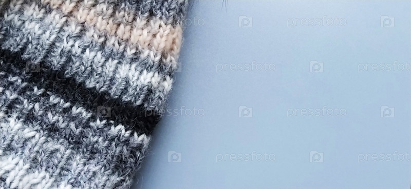 Вязаное теплое изделие типа шарфа или шапки на сером фоне. Вязание разноцветной пряжей. Белые, серые, коричневые, бежевые и черные полосы и узоры на зимней одежде