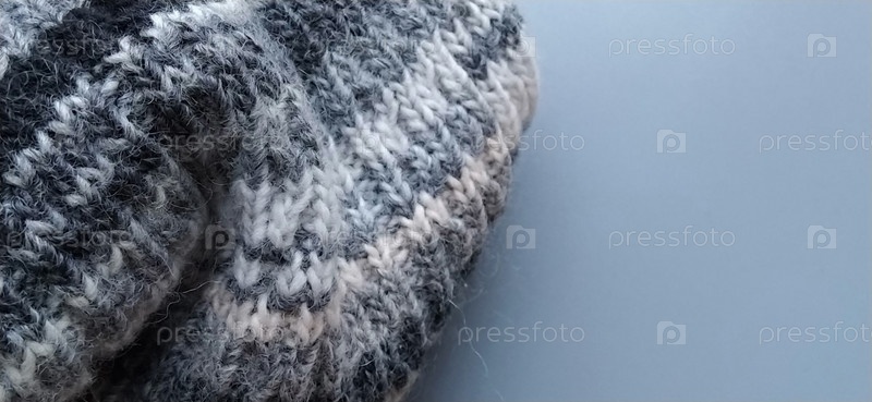 Вязаное теплое изделие типа шарфа или шапки на сером фоне. Вязание разноцветной пряжей. Белые, серые, коричневые, бежевые и черные полосы и узоры на зимней одежде