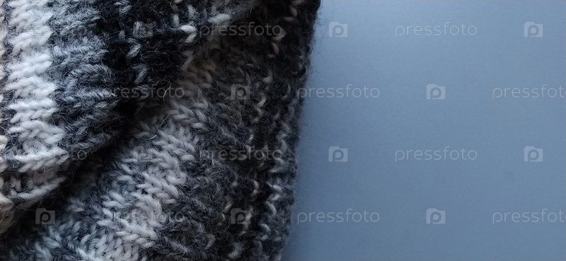 Вязаное теплое изделие типа шарфа или шапки на сером фоне. Вязание разноцветной пряжей. Белые, серые, коричневые, бежевые и черные полосы и узоры на зимней одежде