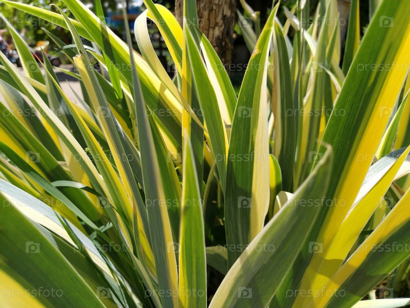 Крупный план желто-зеленых полосатых листьев. Ирисы в саду. Род многолетних корневищных растений семейства Ирисовые. Желто-зеленые длинные полосатые листья. Цветочный фон. Садоводство и цветоводство