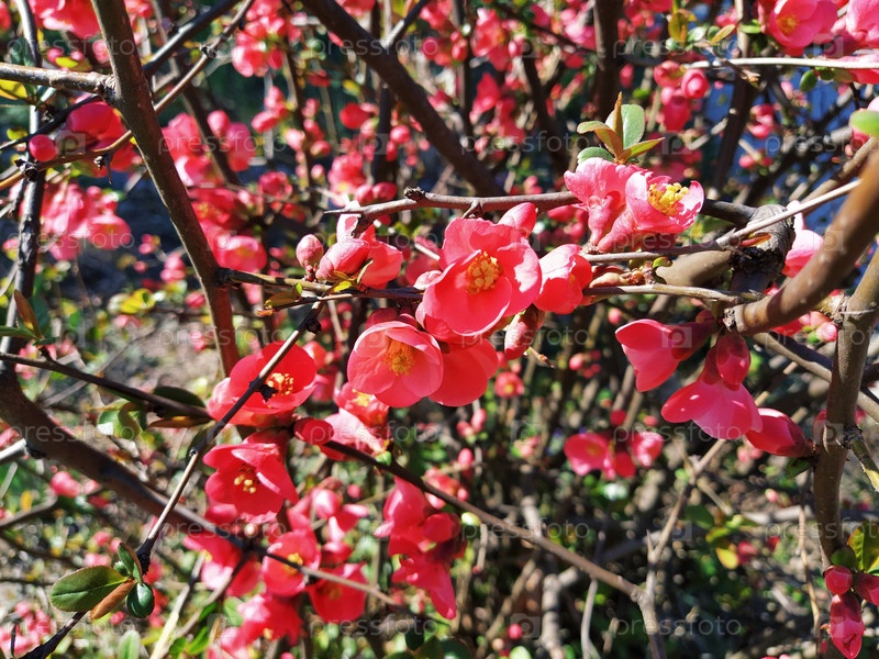 Красивые розовые и красные цветы хеномелеса. Кустарник без листьев зацветает ранней весной. Нежные лепестки и желтые тычинки и пестики с нектаром. Открытка или букет. Символ пробуждающейся природы