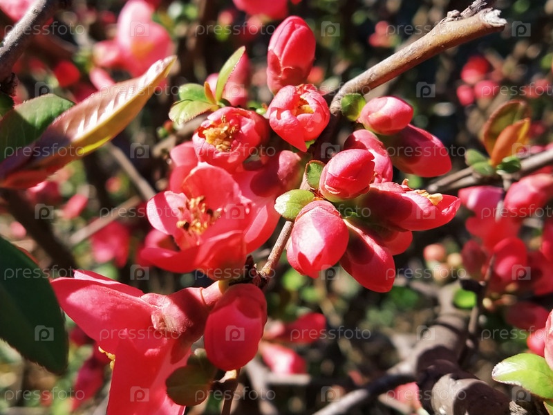Красивые розовые и красные цветы хеномелеса. Кустарник без листьев зацветает ранней весной. Нежные лепестки и желтые тычинки и пестики с нектаром. Открытка или букет. Символ пробуждающейся природы