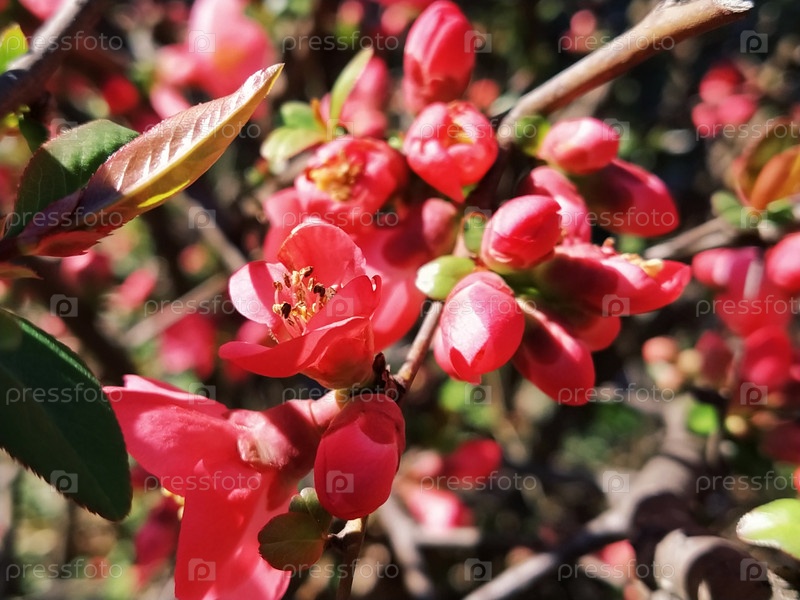 Красивые розовые и красные цветы хеномелеса. Кустарник без листьев зацветает ранней весной. Нежные лепестки и желтые тычинки и пестики с нектаром. Открытка или букет. Символ пробуждающейся природы