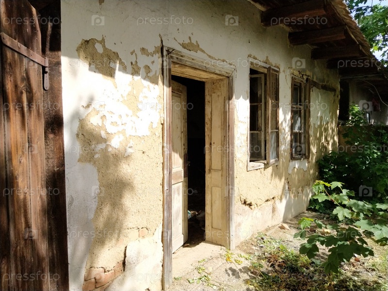 Стена со старыми окнами и дверью в разрушающемся сельском доме. Концепция урбанизации и забвения Родины. Заброшенный дом. Разбитое стекло в окнах и падающая штукатурка