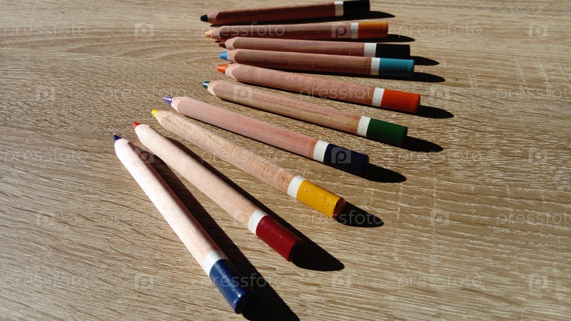 На деревянном столе лежат несколько деревянных толстых цветных карандашей
