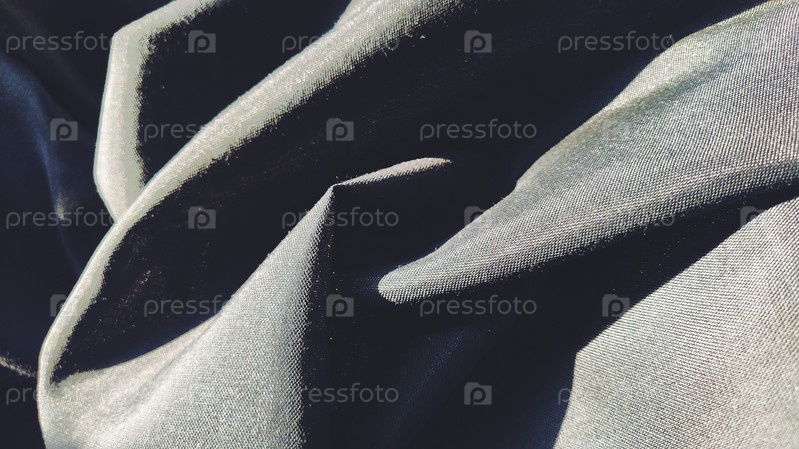 Черная ткань с переплетением нитей крупным планом. Темно-синий оттенок. Приятные красивые волны на материале. Аккуратно сложенная ткань. Оформление интерьера, пошив одежды и штор. Текстильная промышленность