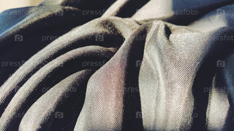 Черная ткань с переплетением нитей крупным планом. Темно-синий оттенок. Приятные красивые волны на материале. Аккуратно сложенная ткань. Оформление интерьера, пошив одежды и штор. Текстильная промышленность
