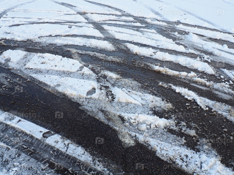 Развилка или разъезд с кольцевой развязки. Сугробы на обочине дороги. Плохая погода и пробки. Снег на асфальте. Сложные условия вождения. Зимняя слякоть на дороге. Тормозной путь автомобиля